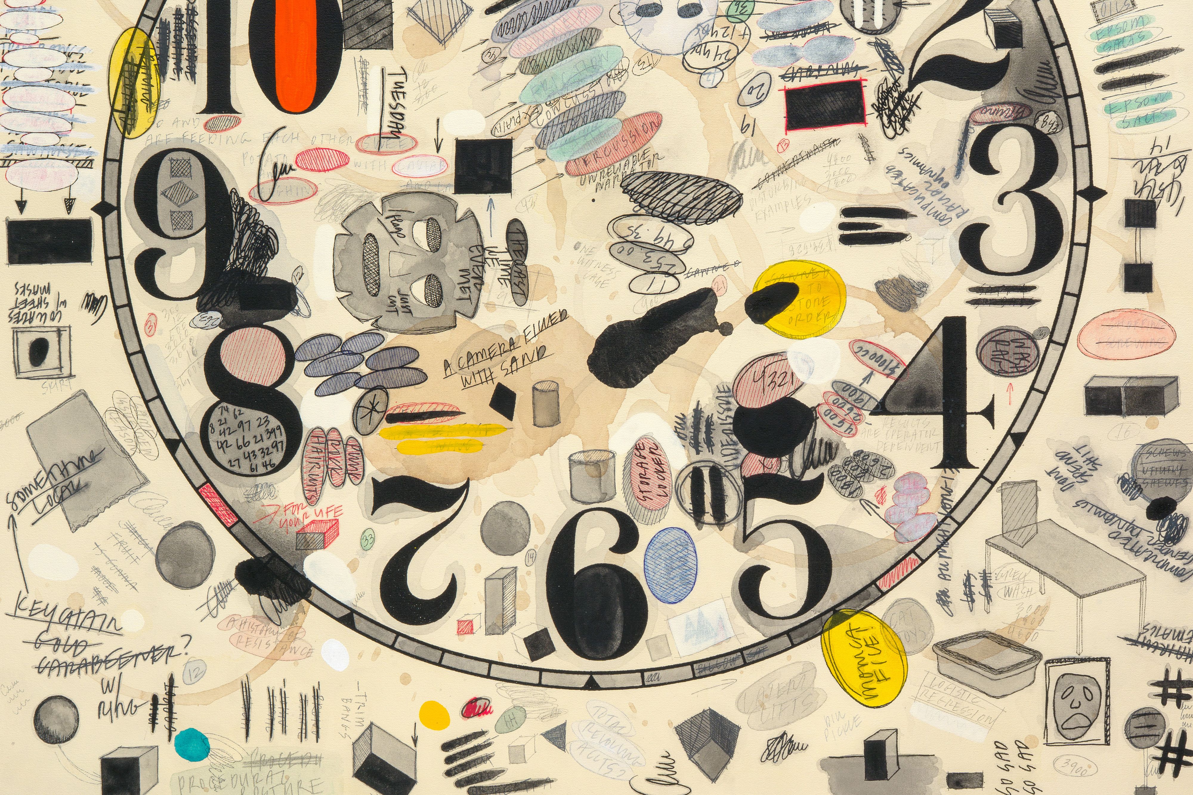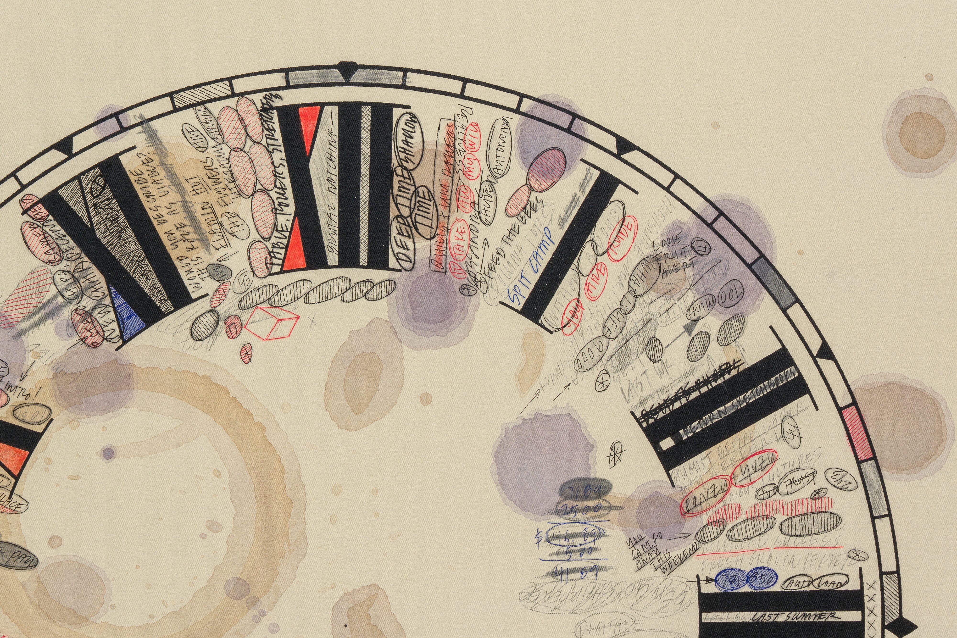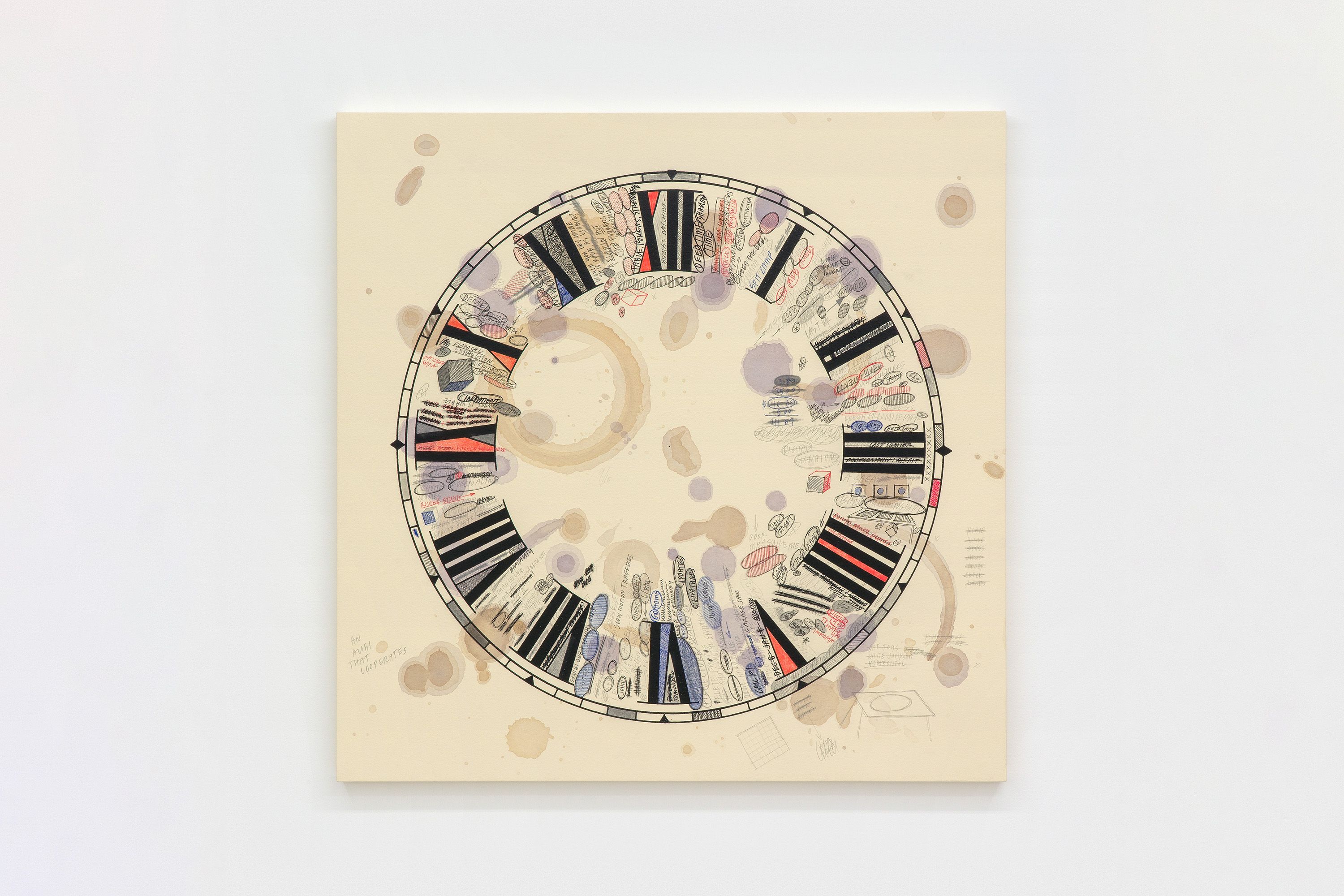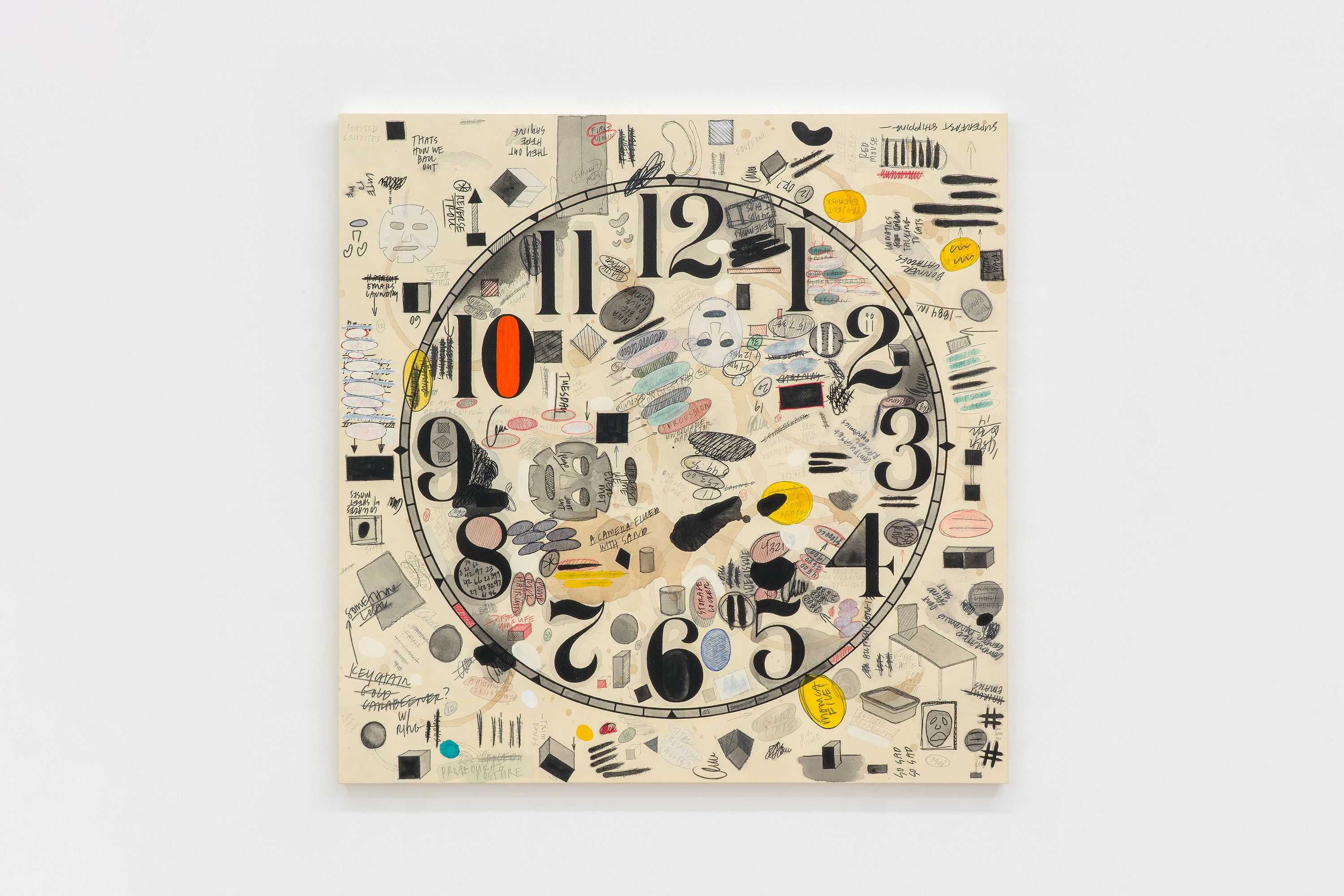Amanda Ross-Ho Untitled Thresholds (FOUR SEASONS), 2025 Luan, poplar, vinyl spackling paste, joint compound, water-based stain (Dark Walnut, Jacobean) Stain & Poly (Mission Oak) latex primer, semi-gloss, eggshell and flat latex paint (Crushed Silk, Sand Fossil, Bone White, Seriously Sand) Tintable Texture Paste, sweat, acrylic paint, watercolor, gouache, black wax, 3D printed PETG, urethane, silver nitrate plating, lacquer, resin, 3D laser cut mdf, acrylic paint, glitter, upholstery tacks, laser cut steel, automotive self-etching primer, enamel spray paint, chroming spray, Metallic Foil Tinsel Garland, Metallic Foil Twist Garland, Metallic Tinsel Garland Trim, foil tinsel Christmas garland, floral wire, pointed back rhinestones, flatback round acrylic rhinestones, holographic glitter vinyl, black metallic cardstock, digital print on cardstock, tissue paper, stiff Shinwon felt, Stitch Witchery, Big White Pom Poms, double faced Polyester Satin Ribbon (dusty blue, ivory, baby pink, red, black), Gold Foil Mirror Card Stock, 2 sided Highly Reflective Mylar film, Canson Colorline paper, adhesive medical gauze, crayon on paper, PET aluminium coated film, digital print on paper, inkjet print on paper, photocopy on paper, digital print on vinyl wall decals, Yatsuo rice paper, ink on low density polyethylene film, beige and white metallic twine, Book Tape (matte and glossy), painter’s tape, upholstery nails, galvanized nails Installation: 11.28 m x 38.1 cm